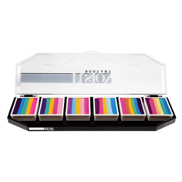 La Paleta Arcoíris Ponies Fusion de Fusion Body Art incluye 6 mini Split Cakes diseñados para crear diseños únicos Florales realistas o de fantasia y para diseños de hermoso follaje, sin dejar por fuera tradicionales como princesas, hadas y otros con tonos diferentes. Esta paleta contiene una combinación especial de colores que no están disponibles en ningún otro formato, lo que la hace única. Los colores combinados en esta paleta evocan la sensación de estar en un Hermoso jardin, brindando un toque único a todos tus diseños.